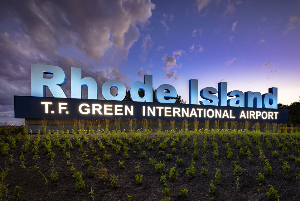 At 20’-0” high x 102’-0” long, this airport ID on I-95 (one of two) is hard to miss. 117,000 lumens of LEDs uplight 10’ high x 2’ deep letters weighing an average of 1200 pounds apiece. The internally illuminated channel letters below feature trimless ½” thick acrylic faces.