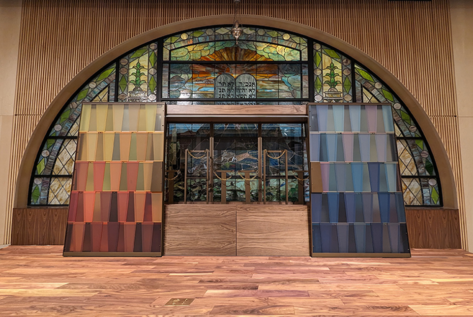 Sacred Hebrew bible scrolls, or “Torahs,” are encased in a holy ark. For Congregation Shaare Zedek in New York City, ARTfx built a contemporary, sliding door ark in dark walnut, bronzed aluminum, and multi-toned acrylic. Original concept and design by Amy Reichert Designs, Chicago, Illinois.